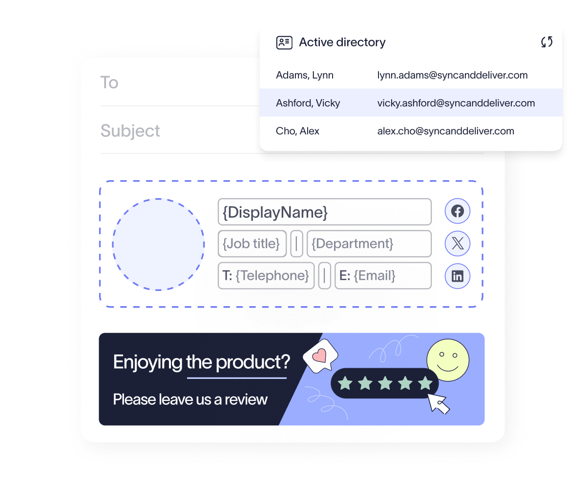 Exclaimer provides twice-daily directory refreshes, with the option to trigger updates manually. It supports directory sync with Microsoft 365/Entra ID (Azure AD), Google Directory, and Okta, giving IT accurate user data from day one and the flexibility to meet compliance needs automatically.
