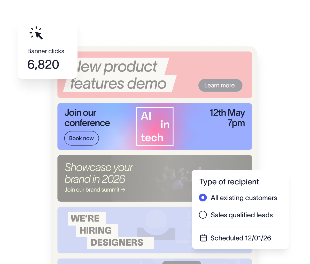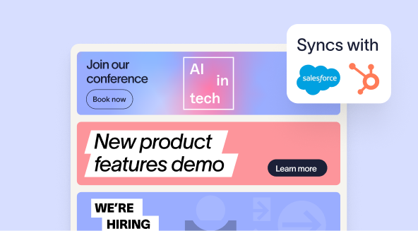 Campaign tools True rotating banners, campaign scheduling, native analytics, and CRM list targeting through Salesforce and HubSpot give marketing teams the tools to run segmented, measurable campaigns. Banner updates are limited to scheduling, with no rotation options for A/B testing. The lack of CRM list targeting also reduces the impact and precision of campaigns.