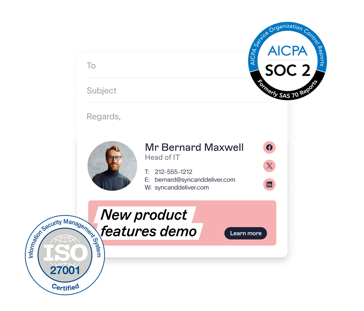 Exclaimer offers enterprise-grade security for organizations of all sizes. Our platform meets leading industry standards, including SOC 2 Type II, ISO 27001/27018, HIPAA, PCI DSS, CSA/ACSC, and regional requirements such as GDPR and CCPA.