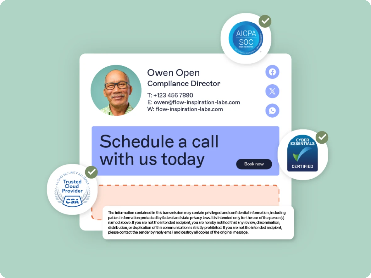 Stellen Sie sicher, dass E-Mail- und Signaturpraktiken mit Datenschutzvorgaben wie DSGVO, HIPAA oder CCPA übereinstimmen. Wenden Sie die richtigen rechtlichen Disclaimer in E-Mail-Signaturen entsprechend regionaler Anforderungen an und verwalten Sie diese zentral, damit sie korrekt und konsistent bleiben.
