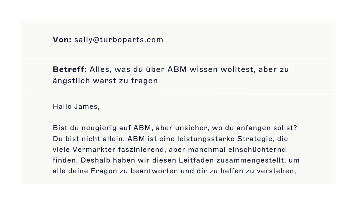 Aber wie können Sie sicherstellen, dass Empfänger Ihre E-Mails lesen, den Inhalt schätzen und Maßnahmen ergreifen? Indem Sie die unten aufgeführten 6 Tipps befolgen. Lassen Sie uns die wichtigsten E-Mail-Best Practices für ABM erläutern.