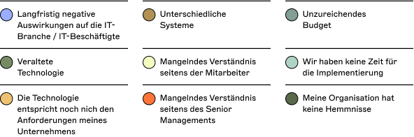 Im Gegensatz dazu geben IT-Leiter an, dass die Implementierung neuer Technologien (42 %) ihre größte Herausforderung ist, gefolgt von der Einhaltung gesetzlicher Vorschriften (36 %) und Sicherheitsbedrohungen (33 %).