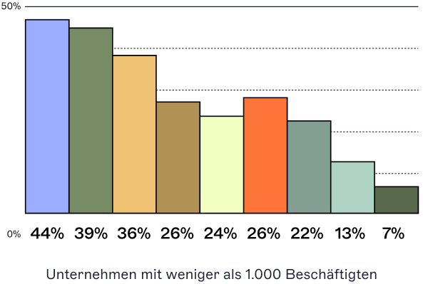 Unternehmen, die KI aktiv nutzen, setzen sie in verschiedenen Geschäftsbereichen ein: 52,25 % zur Automatisierung alltäglicher Aufgaben und 51,35 % zur Unterstützung kreativer Projekte wie der Erstellung von Vertriebsunterlagen und Social-Media-Inhalten. Weitere Anwendungsbereiche für KI sind: