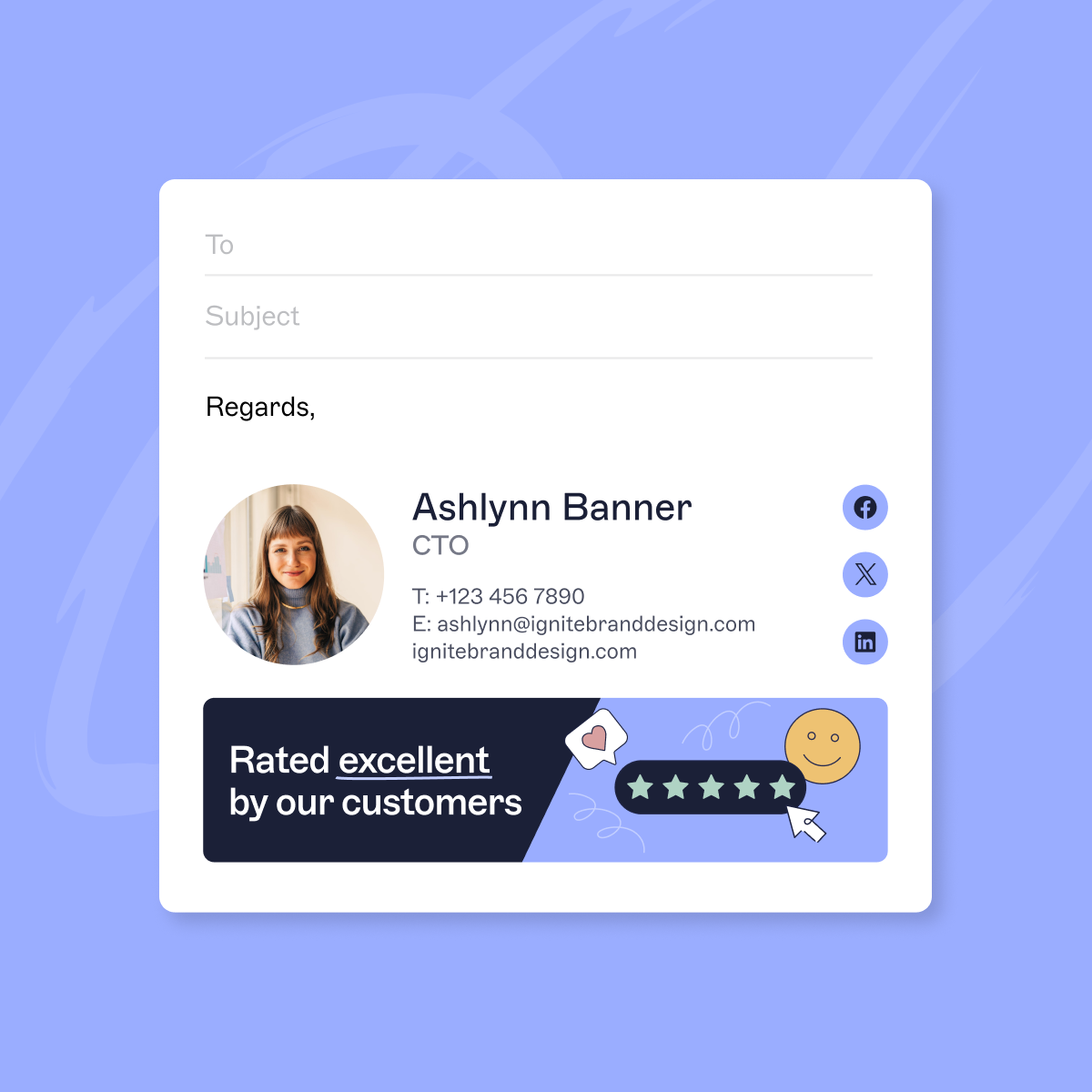Also, was genau ist E-Mail-Signatur-Branding? Es handelt sich um die Praxis, Ihre E-Mail-Signatur - den Textblock am Ende einer E-Mail-Nachricht - mit Ihrem allgemeinen Markenbild in Einklang zu bringen. Es kann Elemente wie ein professionelles Porträt, das Firmenlogo, Kontaktdaten, Social-Media-Symbole, die mit Ihren professionellen Konten verlinkt sind, enthalten - alles repräsentativ für Ihre einzigartige Markenpersönlichkeit.
