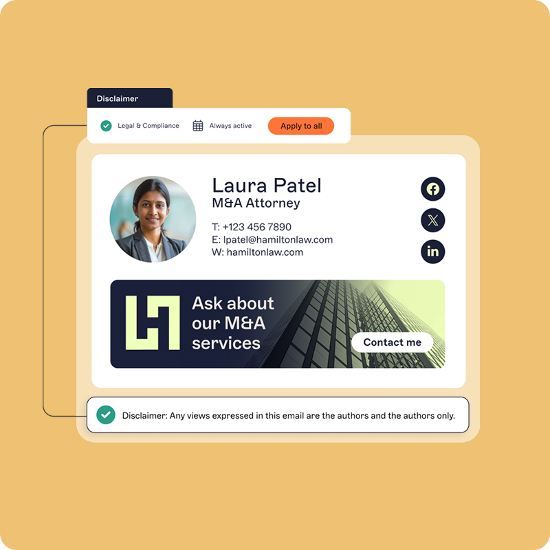Fügen Sie rechtliche Hinweise automatisch ein. Exclaimer hilft Ihnen dabei, DSGVO-Vorgaben sowie branchenspezifische Richtlinien wie HIPAA einzuhalten – mit zentral verwalteten rechtlichen Hinweisen, die automatisch ergänzt werden, ohne dass Mitarbeitende selbst eingreifen müssen.