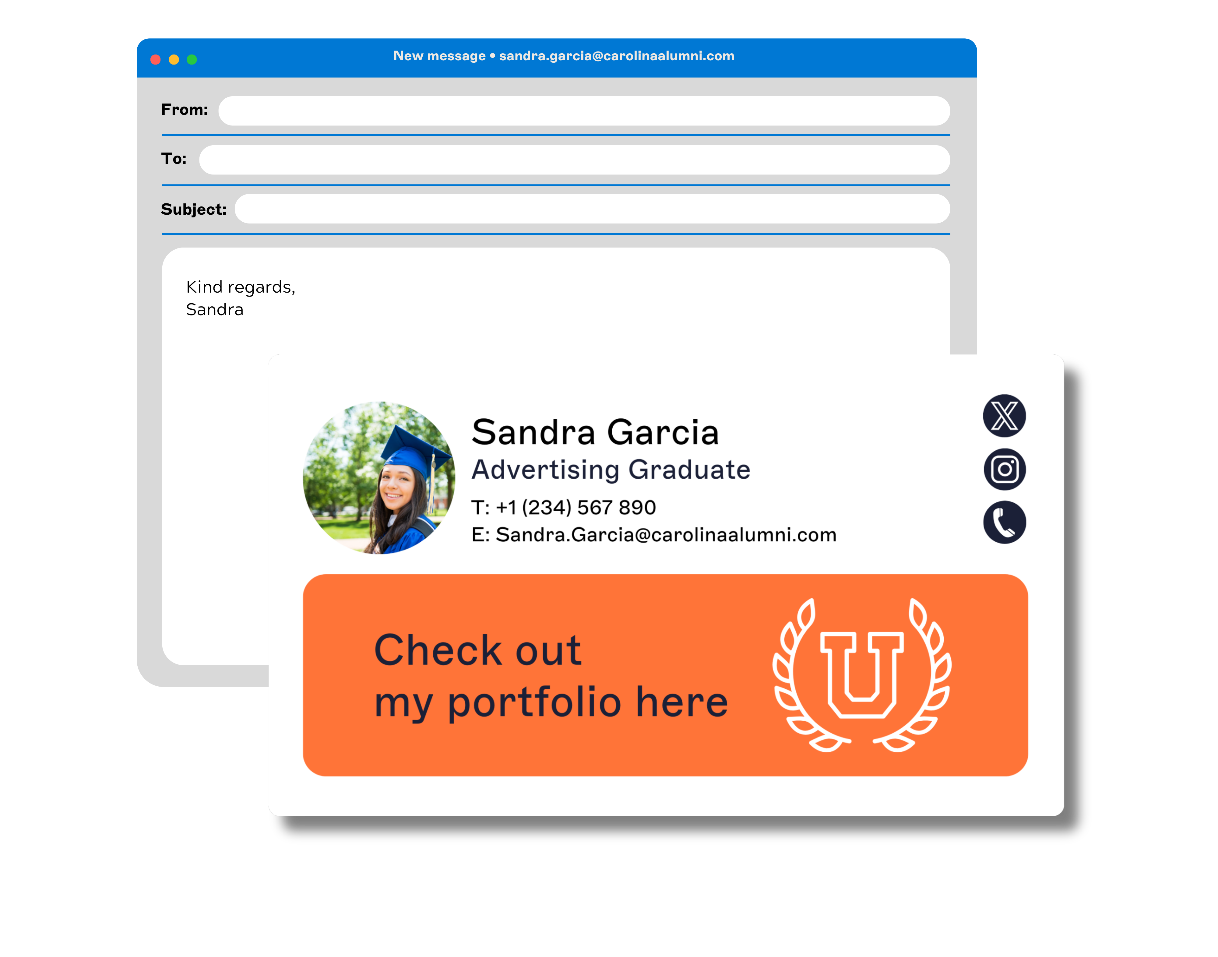 Creating a well-thought-out design will immediately grab the recipient’s attention and showcase why they should engage with your students and your college. Your college will be able to put its branding on every signature.
