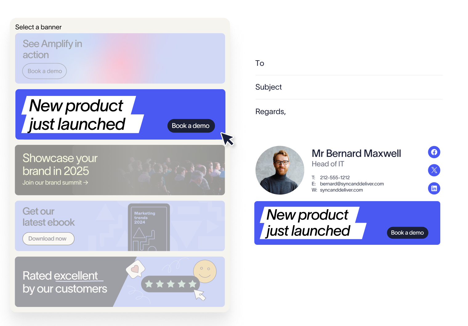 Campaign amplification: Promote demos, content, and events through signature banners without changing rep workflows