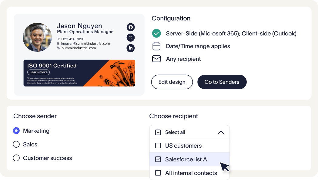 Assign signatures by site, role, or department so every email meets your brand and regulatory standards across all regions.