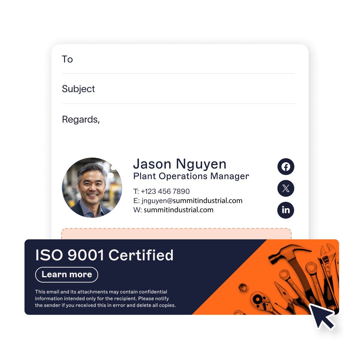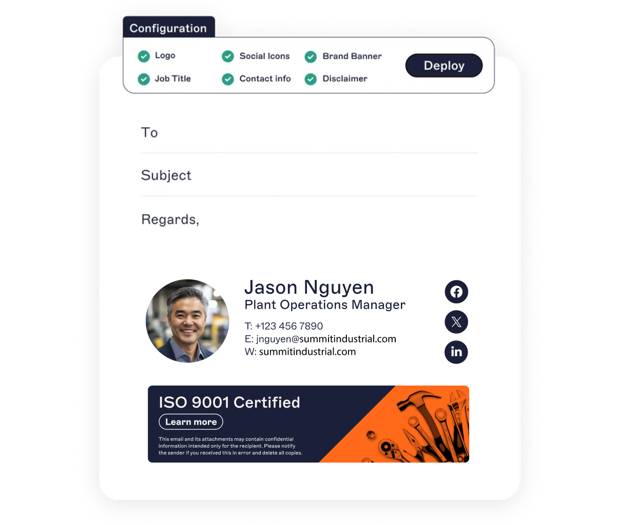Most manufacturing organizations are fully operational within a few hours. Just connect your Microsoft 365 directory (or Google Workspace), design your signature using our drag-and-drop editor, apply smart rules for location or role-based use, and deploy — without disrupting operations or requiring custom scripts.
