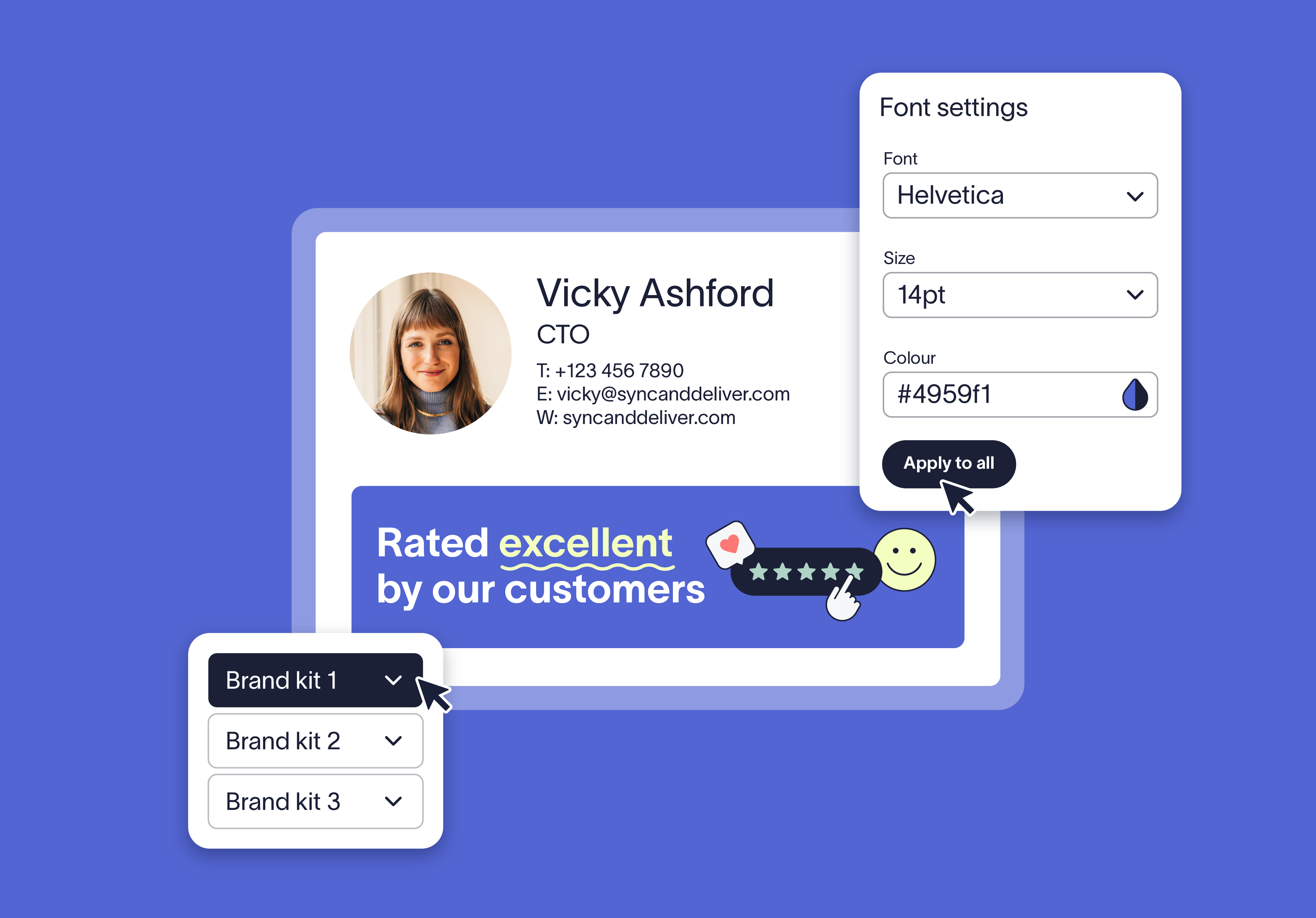 With Brand Kits, you can define logos, icons, fonts, colors, and banners for all of your brands, offices, regions etc. These assets are then available to use in any email signature design, for any of your teams.