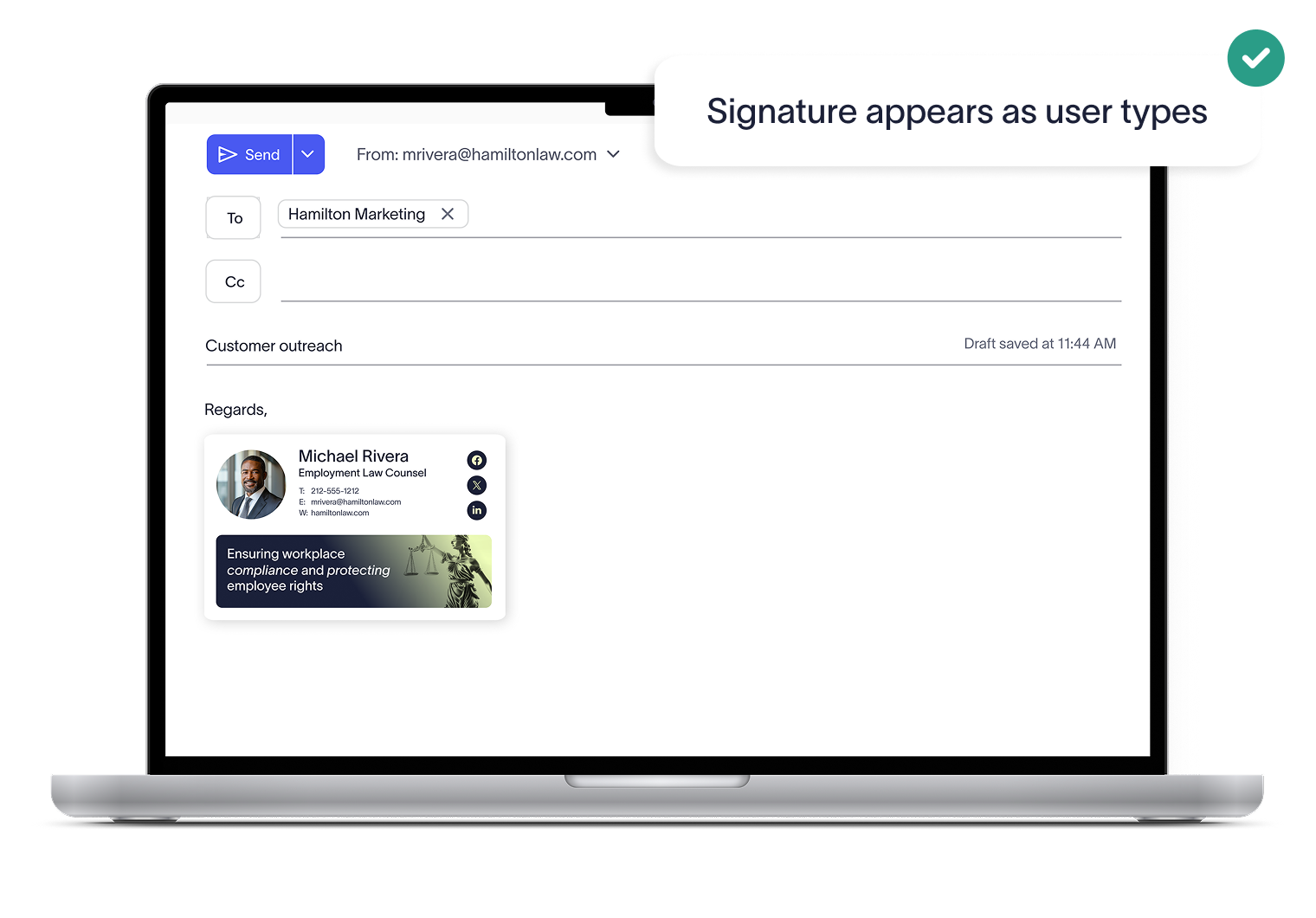 Employees see their signature applied to their message as they type. No second-guessing, no formatting surprises — just effortless assurance that every email sent looks professional and on-brand.