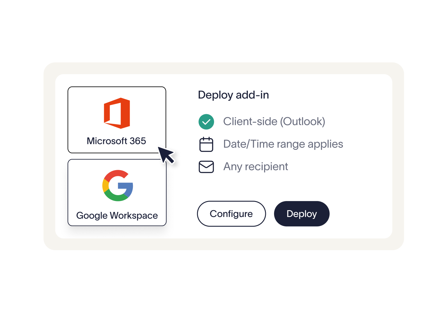 An Outlook add-in (for Microsoft 365) or a Google Workspace app (for G-Suite) is deployed so signatures can be applied inside users’ email clients.