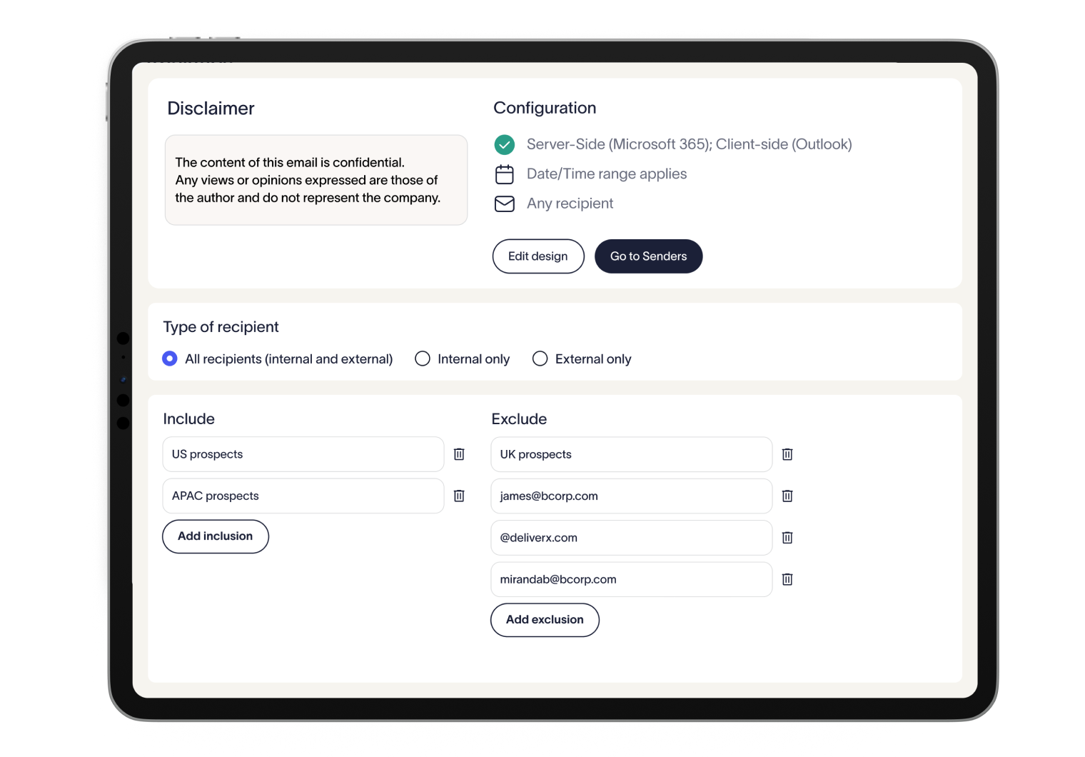 Dedicated settings allow you to tailor disclaimers by sender or recipient. Whether it’s internal teams, external partners, or specific regions, your business can stay compliant while keeping communications relevant.