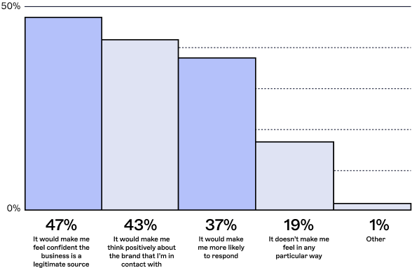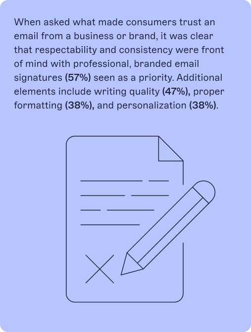 Looking at sentiment triggers more closely, consumers indicated that emails with professionally branded signatures make them feel more confident (47%), think more positively about the organization (43%), and more inclined to respond to the emails (37%).