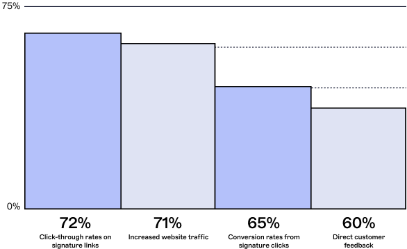 Of those marketers already actively using emails signatures as a marketing tool, the top two effectiveness metrics include click through rates on signatures links (72%) and increased website traffic (71%).